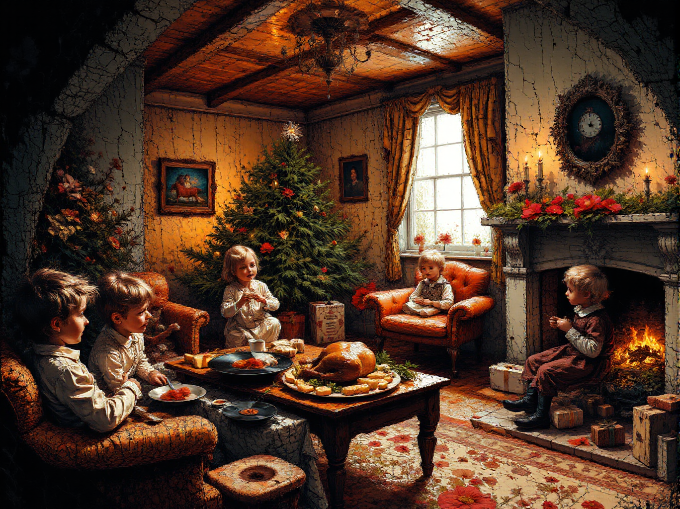 in the deepest darkest space inside the capsule is a typical Victorian Christmas scene set in a Christmas Living Room, the tbe is ladden with goose and roast potatoes. Children are pulling crackers