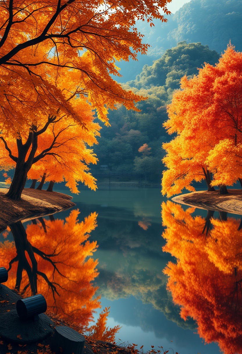 Stunning detail reflection of golden and orange katsura trees around a natural round lake, autumn, realistic, wide shot, art style of Studio Ghibli, magical, whimsical atmosphere, vibrant colors, beautifully lit, serene landscape