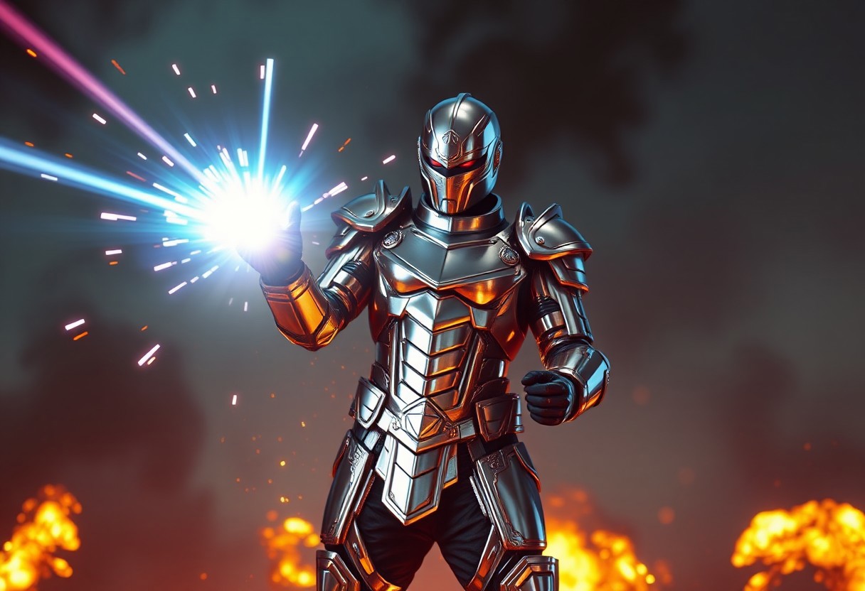 A chrome and silver energy beam hitting an supervillain in an armored suit , the armoured suit is exploding