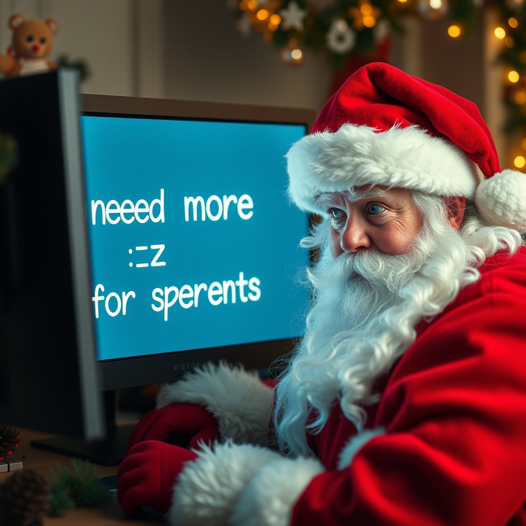 Santa with dumbstruck look looking at computer screen with text "need more buzz for presents", funny, realistic, masterpiece, photograph, festive, decorated