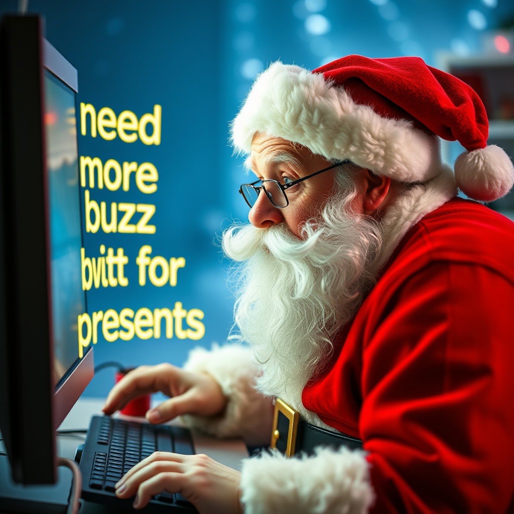 Santa with dumbstruck look looking at computer screen with text "need more buzz for presents", funny, realistic, masterpiece, photograph