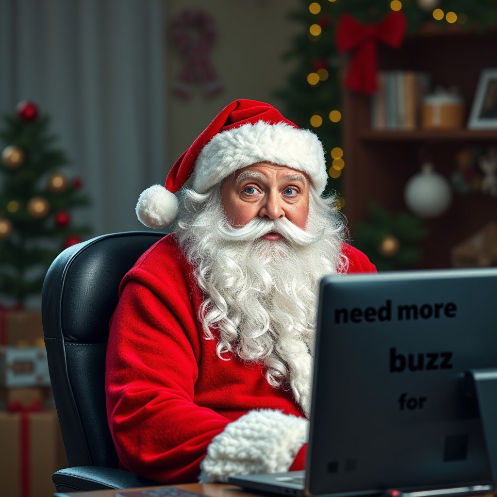 Santa with dumbstruck look looking at computer screen with text "need more buzz for presents", funny, realistic, masterpiece, photograph