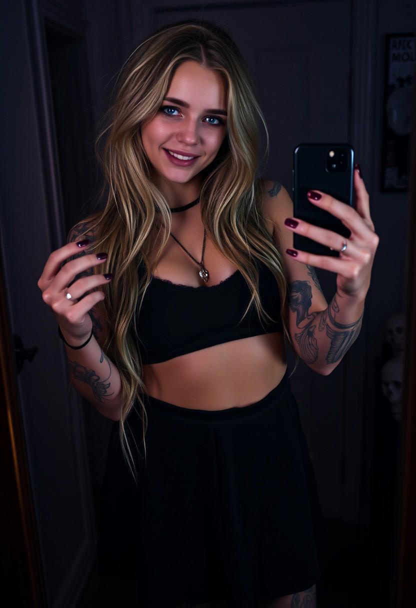 In the soft, dim light of my goth-themed sanctuary, I find myself standing before the mirror, captured in a moment that feels both intimate and electric. My long, messy blonde hair tumbles around my shoulders, framing my youthful face, where high cheekbones and a sprinkling of freckles tell their own story. My blue eyes, large and inviting, sparkle with mischief, enhanced by the flutter of my long lashes. There’s a playful dimple in my smile, an echo of the joy I feel inside. Dressed in a cropped top that reveals my midriff and a flowing skirt that dances just above my knees, I embrace my hourglass figure confidently. The soft touch of my leggings hugs my legs, accentuating their strength, while the necklace around my neck catches the light, adding a touch of glimmer to my goth aesthetic. My tattoos and piercings are a testament to my journey, each one holding a memory, a whisper of who I’ve been and who I aspire to be. In one hand, my phone captures this moment, while in the other, I hold a small handwritten card that simply reads, “Jeg elsker Henrik.” Such words hang in the air like a promise, an echo of a love that fills my heart with warmth. It’s a celebration of self and romance, a snapshot of a life that thrives in the beautiful juxtaposition of darkness and light. Here I stand, unapologetically me.
