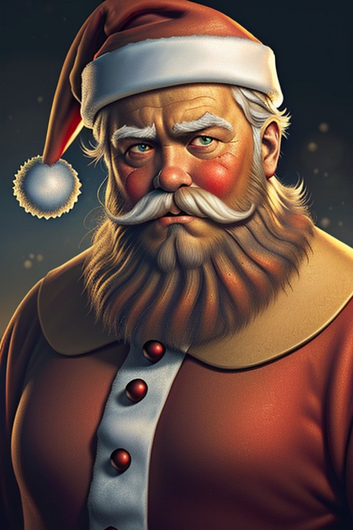 A digital painting of ((Santa Claus)) in a gritty, realistic style. Strong, hard light illuminates the scene, highlighting warm autumnal colors. Harsh shadows emphasize his cruel expression and a sinister glint in his eyes. His face is ruddy and his beard is tangled. Gingerbread_Man, food, cookie, food focus, no humans