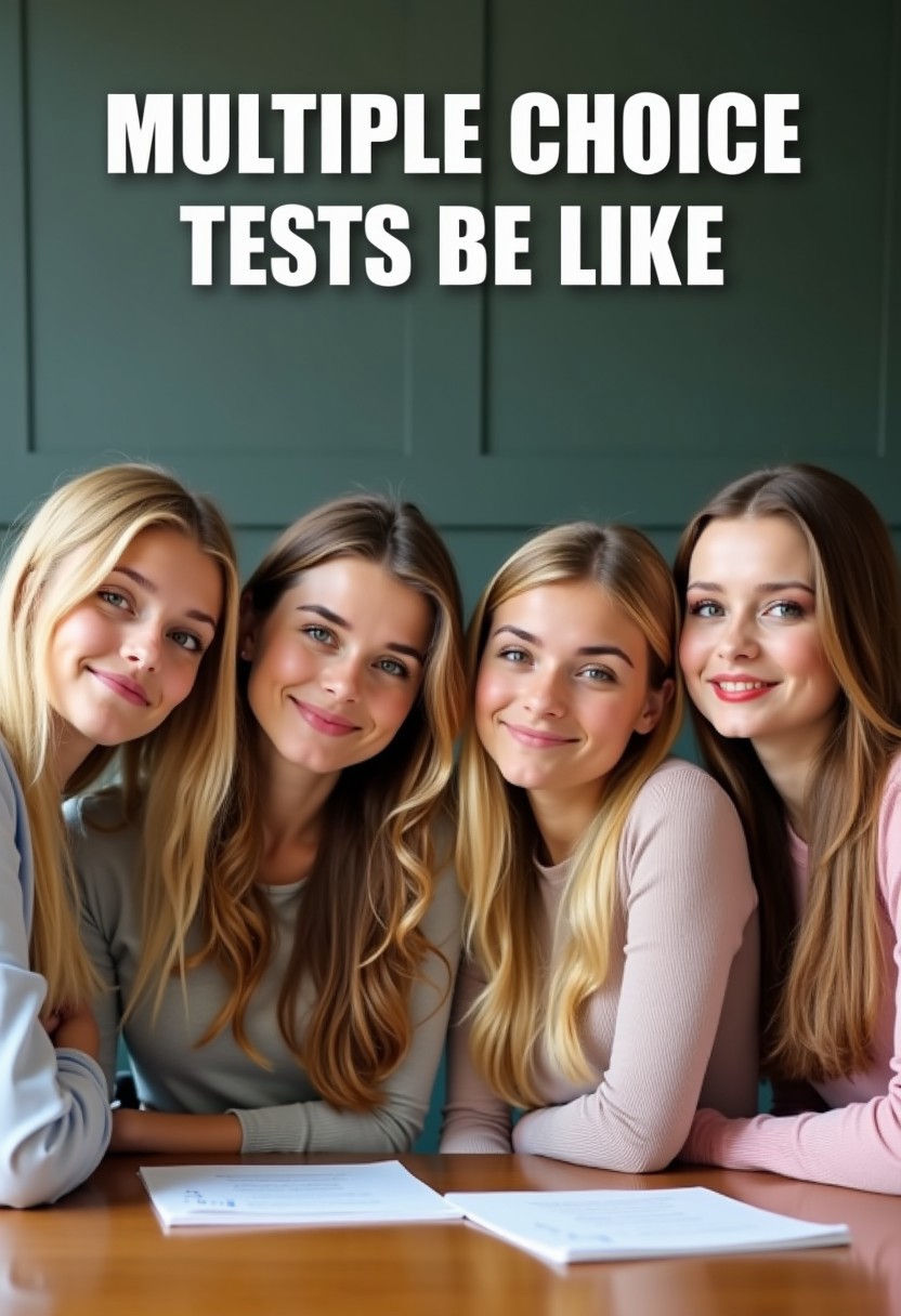 realistic photo of four only slightly differently looking blonde woman sitting by a table looking at viewer, text on the top says "multiple choice tests be like", bold white text on the top