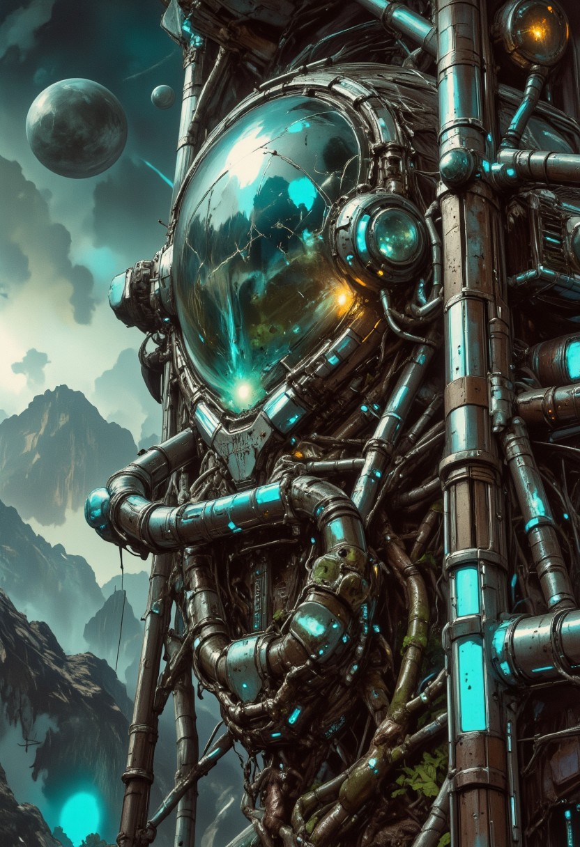 "Ultra-realistic sci-fi cinematic scene showcasing Earth's Moon transformed into a verdant fortress satellite. The moon’s surface is fortified with sleek metallic domes, robust support pylons, and sprawling networks of reinforced bunkers blending seamlessly into the dense, bioluminescent forest. These structures feature intricate lattices and angular reinforcements, layered with adaptive shielding panels for added defense. Massive, interconnected root-like conduits stretch from central power cores deep within the moon, supplying energy to essential systems like atmospheric generators and defense shields, their faint hum and glow illuminating the forested expanse. Orbiting docking stations hover above the surface, connected to the moon via sleek, carbon-fiber bridges and magnetic lifts, providing access to surrounding spacecraft. Through the grand, crystalline viewing towers, panoramic vistas of Earth and the Solar System unfold, visible through reinforced, transparent alloy windows that arc gracefully into the structure’s frame. Each defensive turret, embossed with mythic symbols and enhanced with automated targeting systems, merges both function and form. The structure emits a soft, otherworldly luminescence as the moon orbits, showcasing a unique blend of raw natural beauty and advanced technological architecture.”