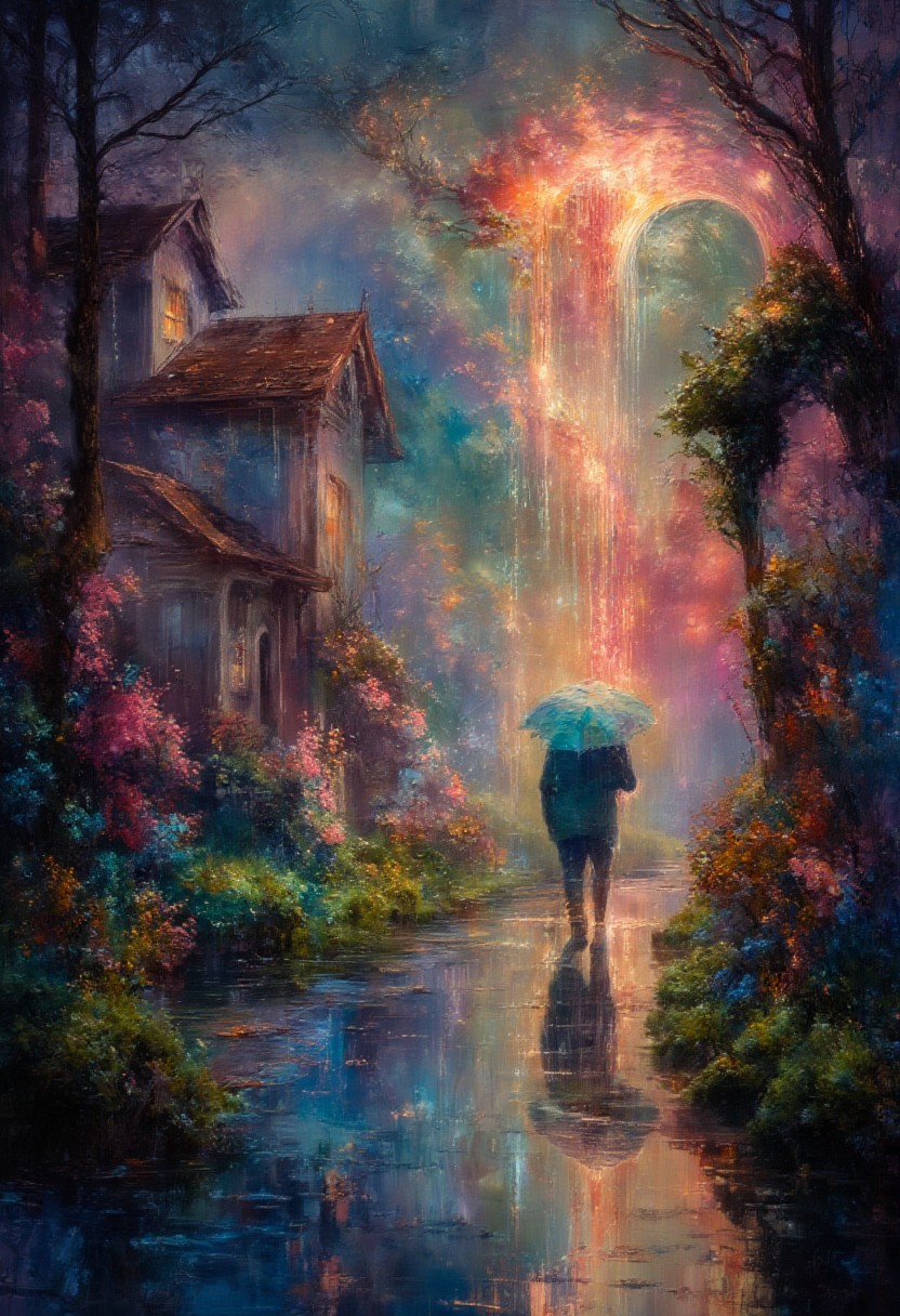 A beautiful Rainy Country Village, A villager walking into the scene holding an umbrella that produces a glow that contrasts with the rest of the scene, Vibrant Glow