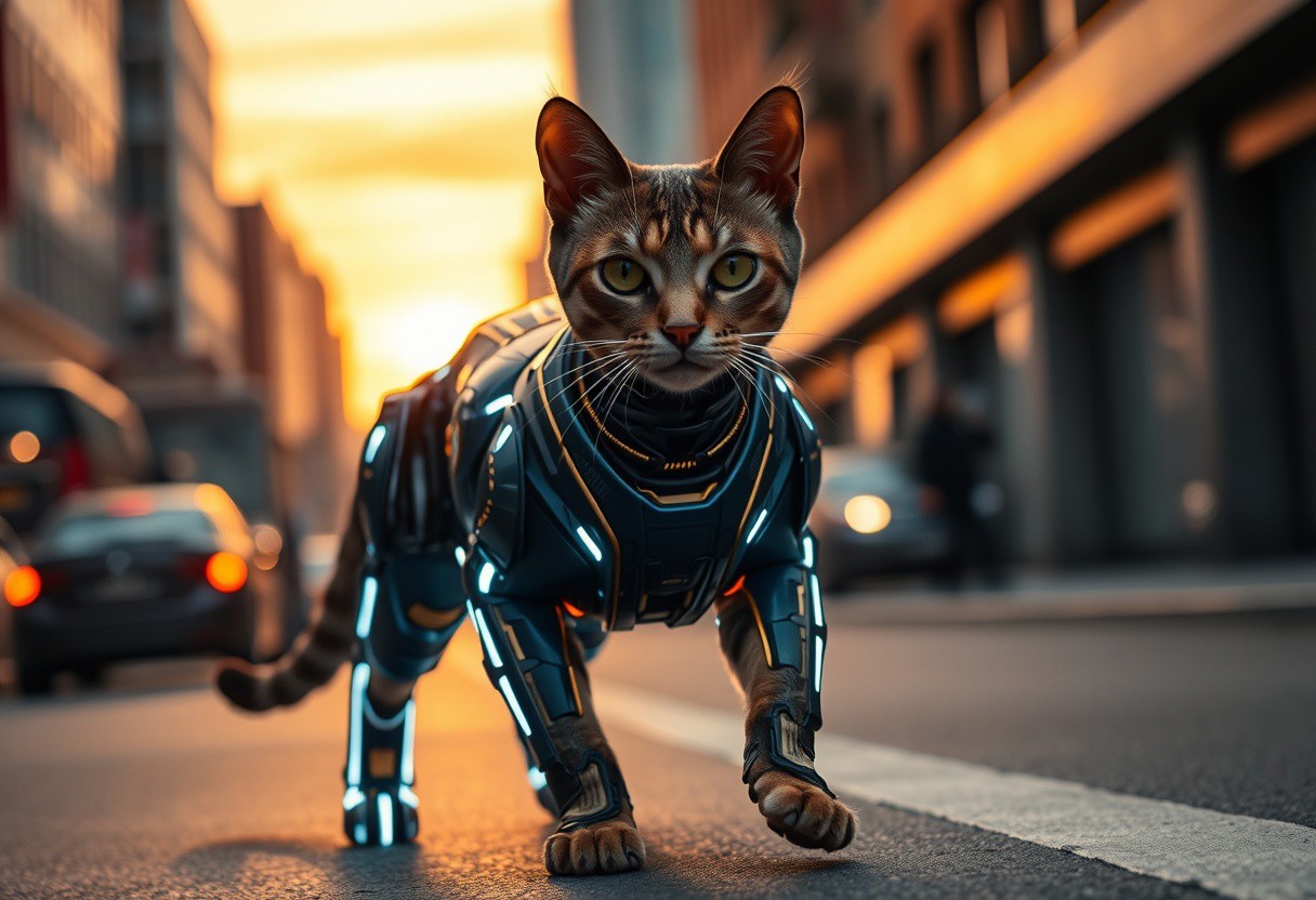 facing camera, beautiful cat's head, on a navy blue cyborg cat's body with gold trim, face and eyes and neck are normal, neon lights outline legs and body, bright studio lights are lighting face, walking down a city street on all four paws, at dusk, sun is behind but not visible