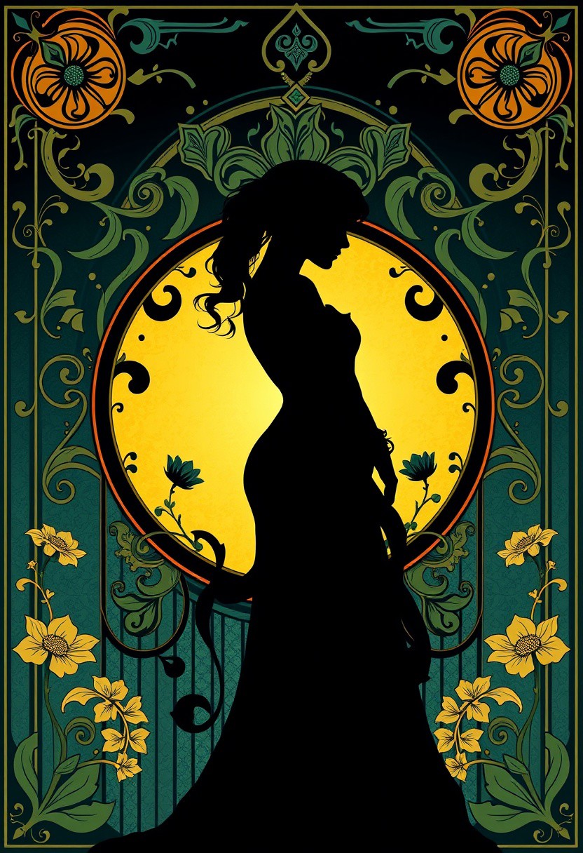 Rich deep teal silhouetted figure, backlit. Art Nouveau style, intricate patterns, flowing lines, botanical motifs, harmonious composition. Poster art, elegant typography, late 19th-century design. Luxurious, vibrant color palette. Masterpiece quality.