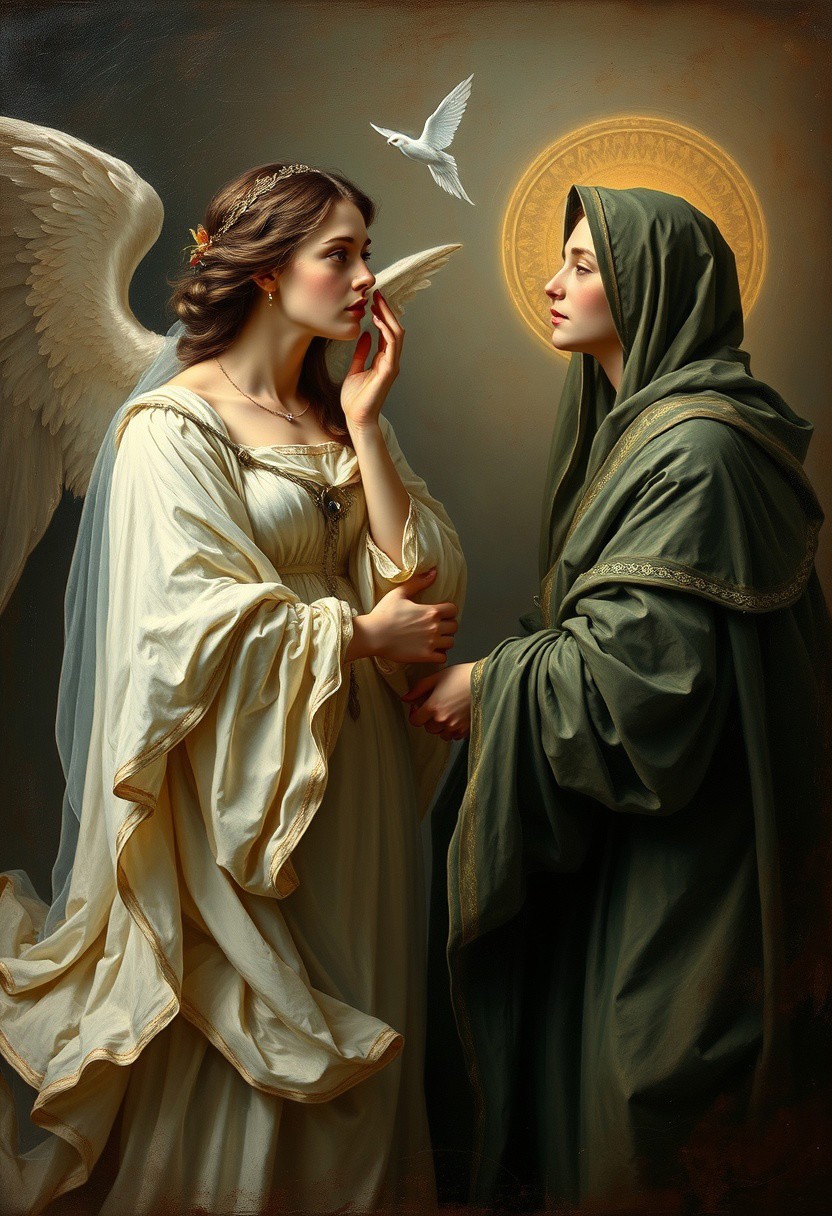Ethereal spiritual oil painting depicting a whispered conversation between Madame X and an artist. Classical Baroque style with religious themes, soft color palette, chiaroscuro, delicate figures in flowing drapery, serene expressions, balanced symmetry, intricate details. Rich textures, visible brushstrokes, and a light aura create a mystical feeling.