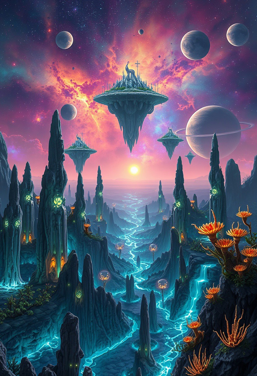 A breathtaking alien landscape, on a distant planet, featuring towering, bioluminescent flora and floating islands suspended in a vibrant , nebula-filled sky. The terrain is a mix of crystalline formations and glowing, otherworldly plants. Rivers of liquid light flow through the valleys, casting an ethereal glow across the scene. Strange, luminescent creatures can be seen in the distance, blending seamlessly with the fantastical environment. The horizon is dotted with multiple moons and a giant, ringed planet, adding to the surreal beauty of this extraterrestrial world