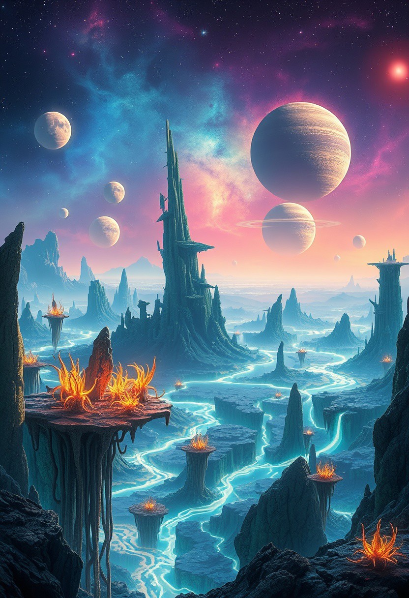 A breathtaking alien landscape, on a distant planet, featuring towering, bioluminescent flora and floating islands suspended in a vibrant , nebula-filled sky. The terrain is a mix of crystalline formations and glowing, otherworldly plants. Rivers of liquid light flow through the valleys, casting an ethereal glow across the scene. Strange, luminescent creatures can be seen in the distance, blending seamlessly with the fantastical environment. The horizon is dotted with multiple moons and a giant, ringed planet, adding to the surreal beauty of this extraterrestrial world