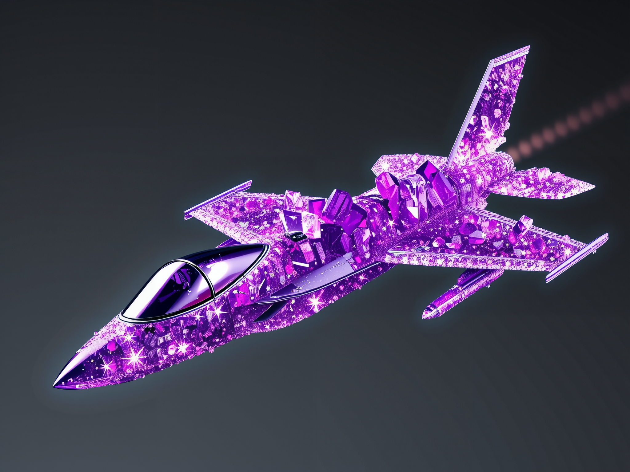 sparkling amethyst crystals, N image of a RAF F-35 jet made of sparkling amethyst crystals