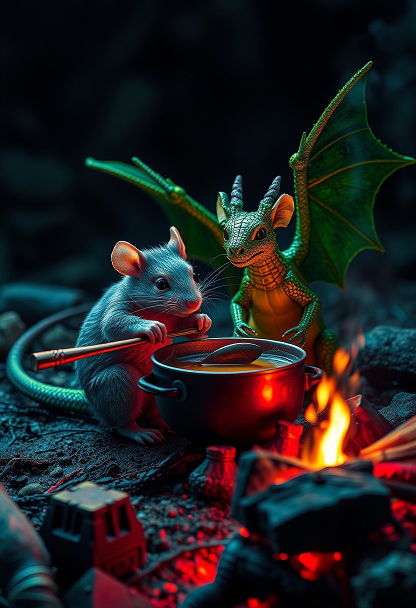 surreal VFX, nano-rat stirring broth on a campfire with a steel red spoon, sitting with the green nano-dragon with dark green wings seen under an electron scanning microscope, with details, vivid colors