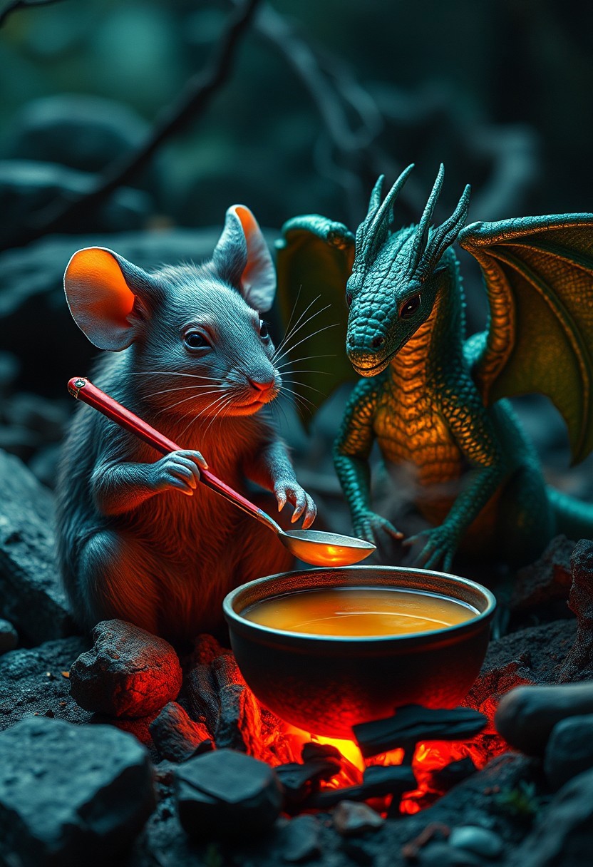 surreal VFX, nano-rat stirring broth on a campfire with a steel red spoon, sitting with the green nano-dragon with dark green wings seen under an electron scanning microscope, with details, vivid colors