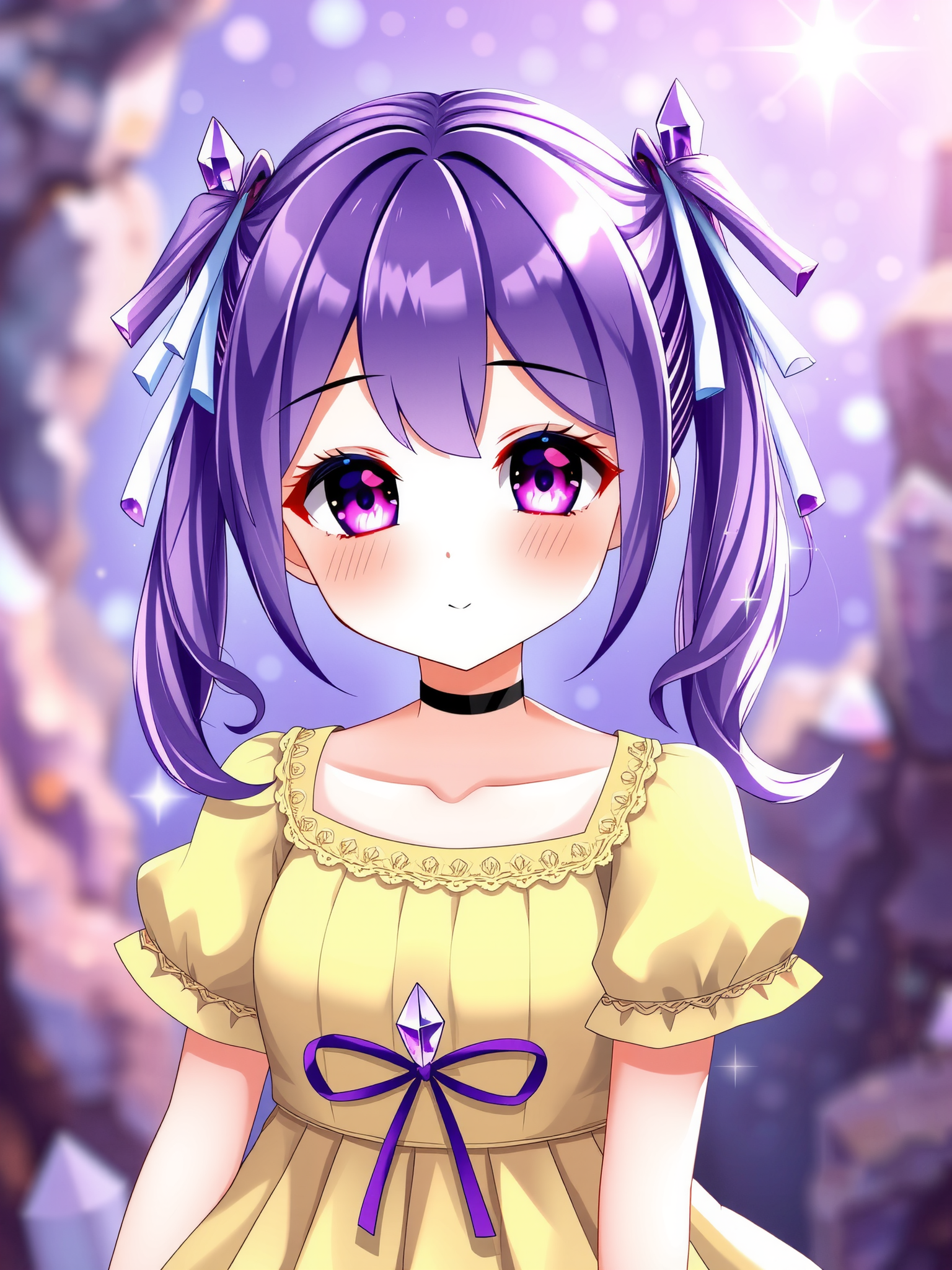sparkling amethyst crystals, 1girl, amethyst eyes, amethyst hair, yellow dress, blurry, blurry background, choker, collarbone, colored eyelashes, dress, sparkling amethyst crystals background, hair ribbon, pale skin, pleated dress, ribbon, short sleeves, solo, twintails