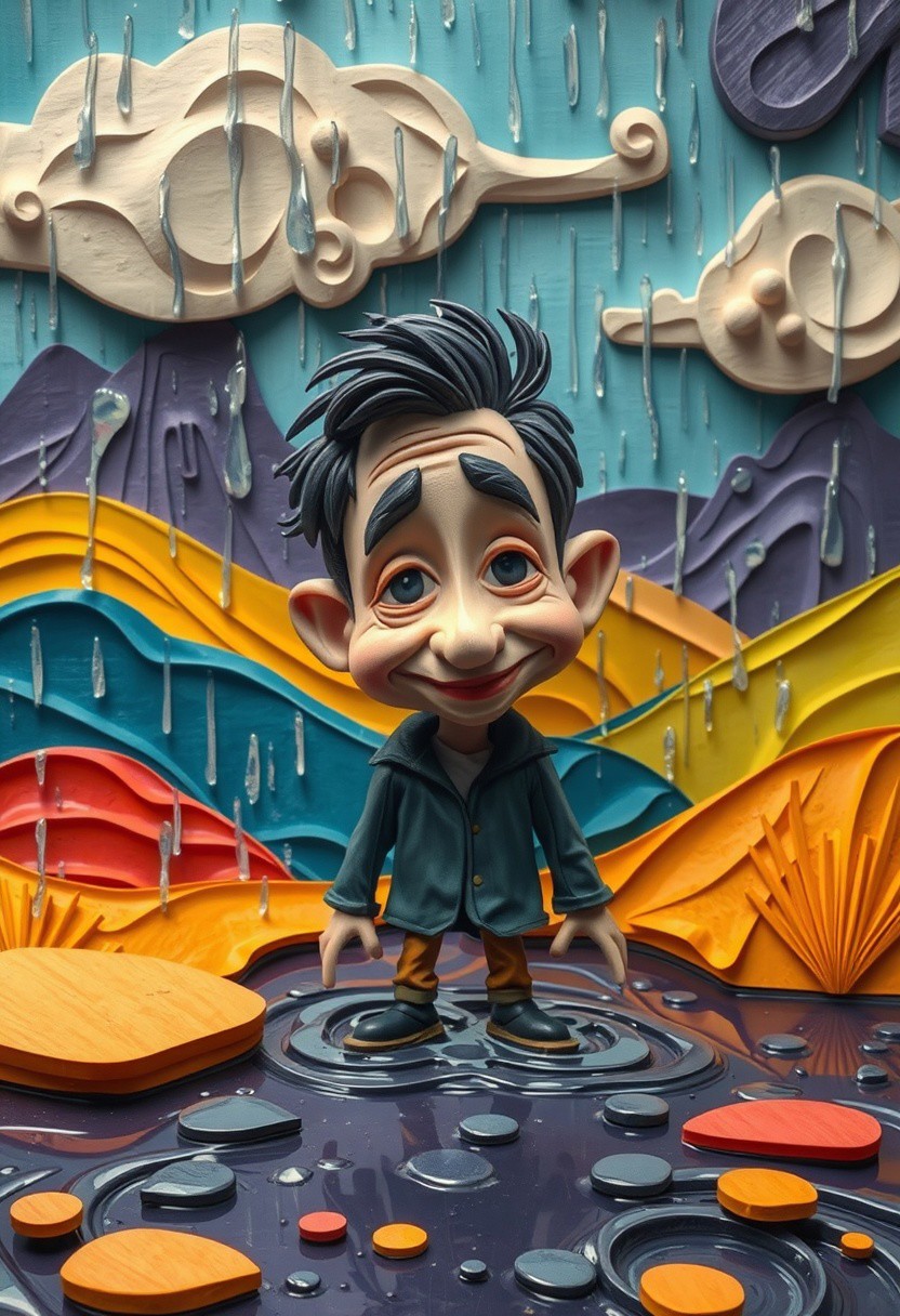 A caricature figure in a wet rainy scene crafted from layered papier-mâché. Stylized landscapes, bold graphic shapes, and vibrant color gradients in a surreal realism style, with sculpted textured layers, drizzling rain, and reflective surfaces.