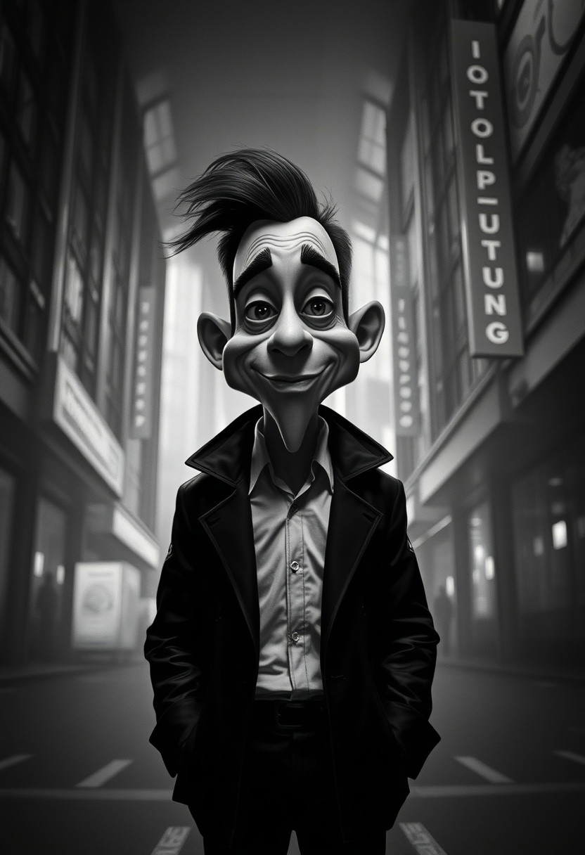 A classic black and white image of a caricature figure in a surreal urban setting. Artistic lighting, abstract patterns, cinematic composition, geometric simplicity, timeless elegance, introspective mood.