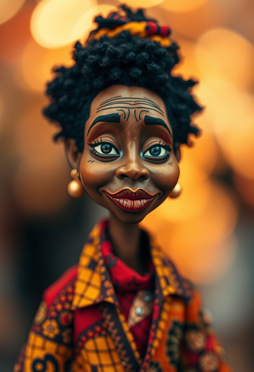 Warm blurred bokeh effect enhances a narrative art caricature figure. The bold color palette uses reds, oranges, and yellows, combined with quilted textures and storytelling through textiles. The style reflects African-American heritage, cultural identity, activism themes, and folk-art influences. The figurative composition uses dynamic patterns, expressive faces, and community-centered scenes within historical narratives and vibrant symbolism, creating a mixed-media piece. Sharp subject focus contrasts with a soft background.