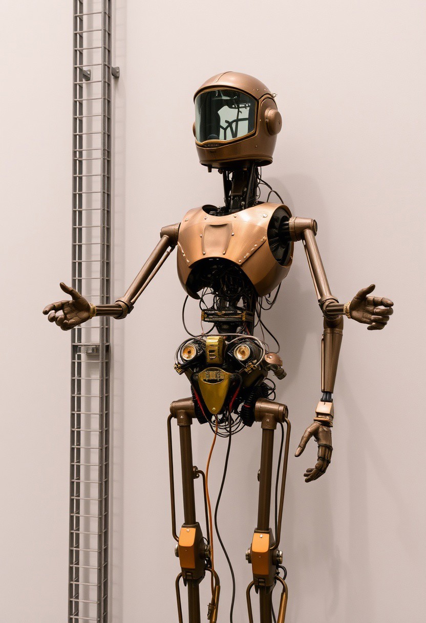 The image is a photograph of an intricate, modern art installation, likely displayed in a museum or gallery. The subject is a humanoid robot or a mechanical sculpture, standing upright. The robot's body is constructed from a combination of metal and other materials, including what appears to be a mix of copper, bronze, and possibly other metals, giving it a warm, reddish-brown hue. The robot's upper body features a helmet-like structure with a transparent, possibly glass-like visor, revealing a complex, inner mechanical structure beneath. Its arms are elongated and jointed, with mechanical fingers extended outward. The torso and lower body are equally intricate, showcasing a labyrinthine arrangement of metal rods, gears, and wires, giving the impression of a detailed, mechanical skeleton. The background is a plain, light gray wall, providing a stark contrast to the robot's rich, earthy tones. To the left of the robot, there's a vertical, metallic structure, possibly a wall-mounted display or a part of the exhibit's framework. The overall style of the robot suggests a blend of industrial and organic design elements, with a futuristic, almost biomechanical aesthetic. The lighting is soft and even, highlighting the intricate details of the robot's construction.