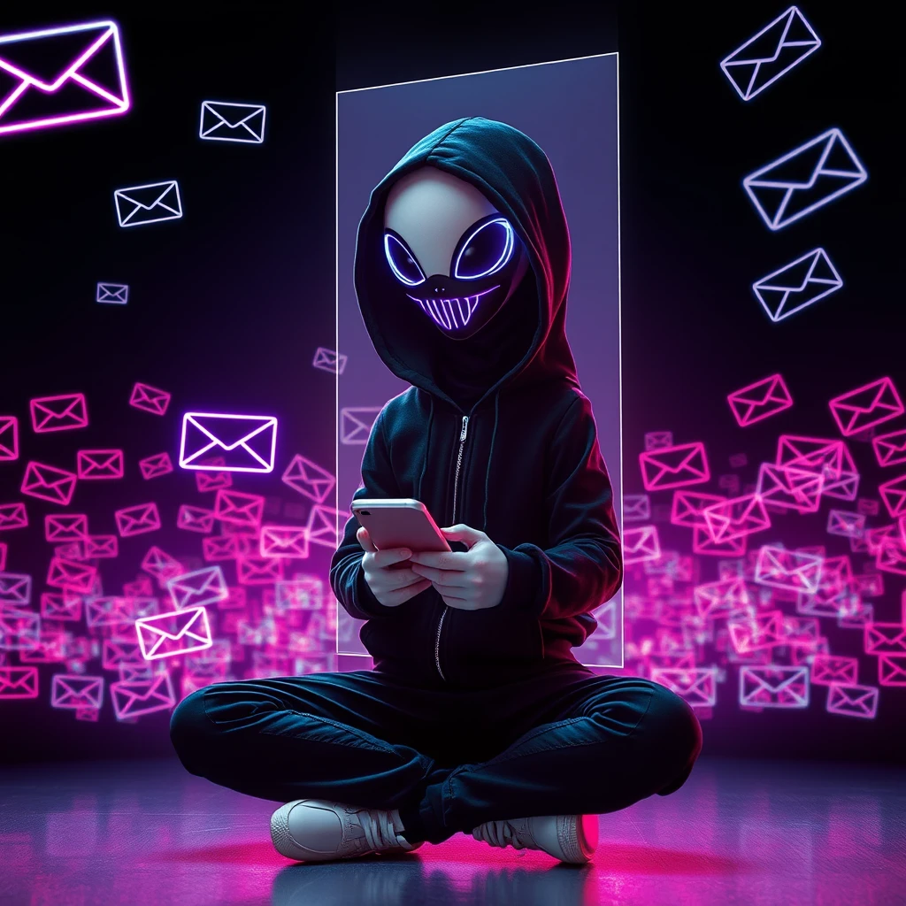 ultra real, most insane photo, a strange doll with a large white head, a black hoodie with a hood and a zipper, a black wraith mask with neon, holding a mobile phone in her hands, sitting cross-legged in black pants and white sneakers, a holographic projection above the body, alien neon symbols characters locked inside the projection of a hologram, against the background an of a a lot of holographic envelopes are flying in a spectral stream of information, overdetail, not obvious, unexpacted perspective, entourage, melancholic, authentic, 8k