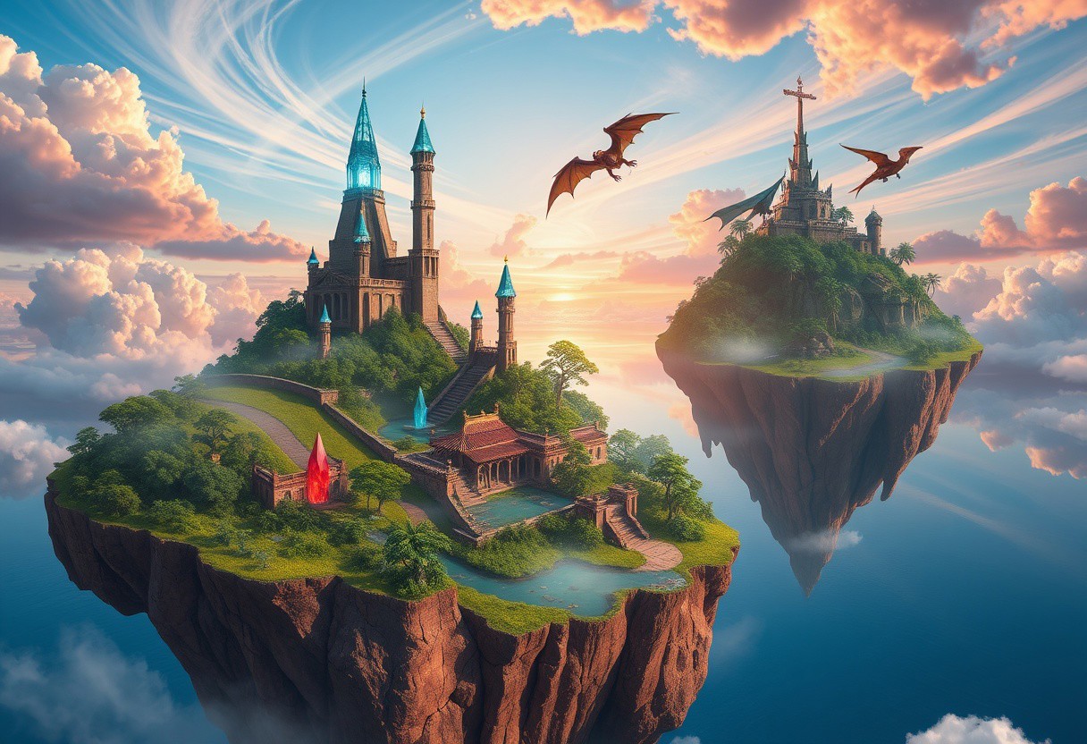 ((blue, orange, pink, sky)), clouds, swirling, 3 floating continent sized islands, the islands are floating high above the ocean, the islands are floating gracefully, the islands are spaces apart, crystals are floating around the islands, eastern dragons are flying between the islands,mountains on floating islands, massive forests on floating islands, jungle trees, vines, beautiful plants, ruins on floating islands, castle ruins, bridge ruins, tall spires on floating islands, crumbling spires, large crystals above spire, blue crystals , red crystals , floating crystals , crystals floating in sky, trees on floating, exposed earth underneath floating island, dragons flying in sky, dinosaurs on floating islands, jungle ruins, landscapes, eastern dragon, intricate details, background colourful, cloud streams, dynamic, vibrant colours, high quality, detailed, realistic, beautiful,