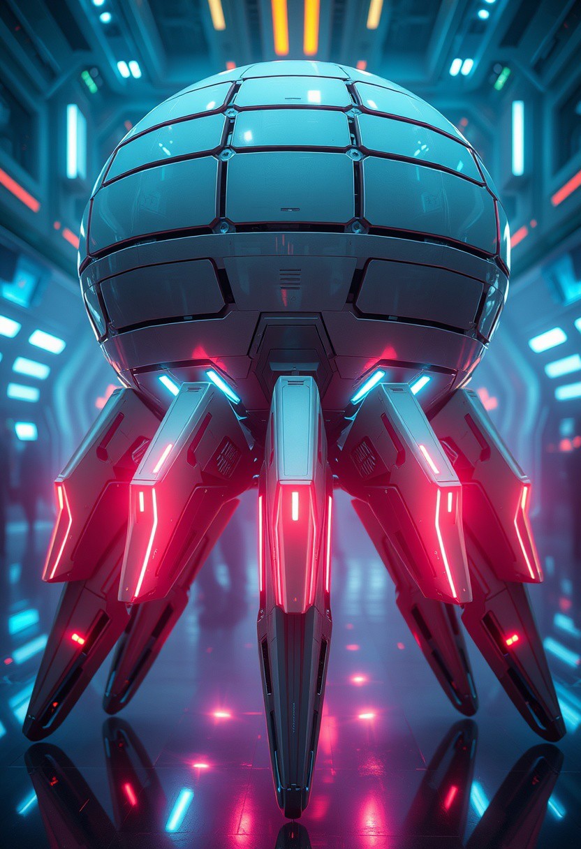 Imagine a highly detailed, futuristic spherical mech, whose lower half seamlessly transforms into four symmetrical triangular segments serving as legs. These triangles taper to sharp points as they extend downward, naturally integrated into the sphere's surface. The legs showcase interlocking structures with sleek, metallic finishes, and the edges are highlighted by glowing, subtle energy channels. The scene emphasizes the mech's majestic presence in a futuristic setting, characterized by shimmering technology and vivid light effects, creating an aura of movement and innovation.