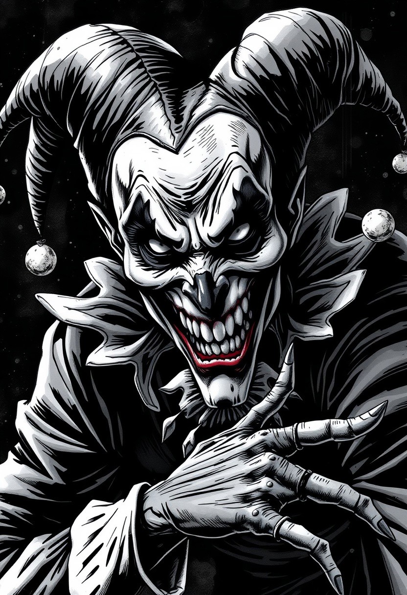 A creepy haunted jester in a comic book style, rendered in jet black ink with strong hard light, highly detailed linework, dynamic composition, polished finish, superhero themes, expressive features, dramatic pose, and deep shadows.