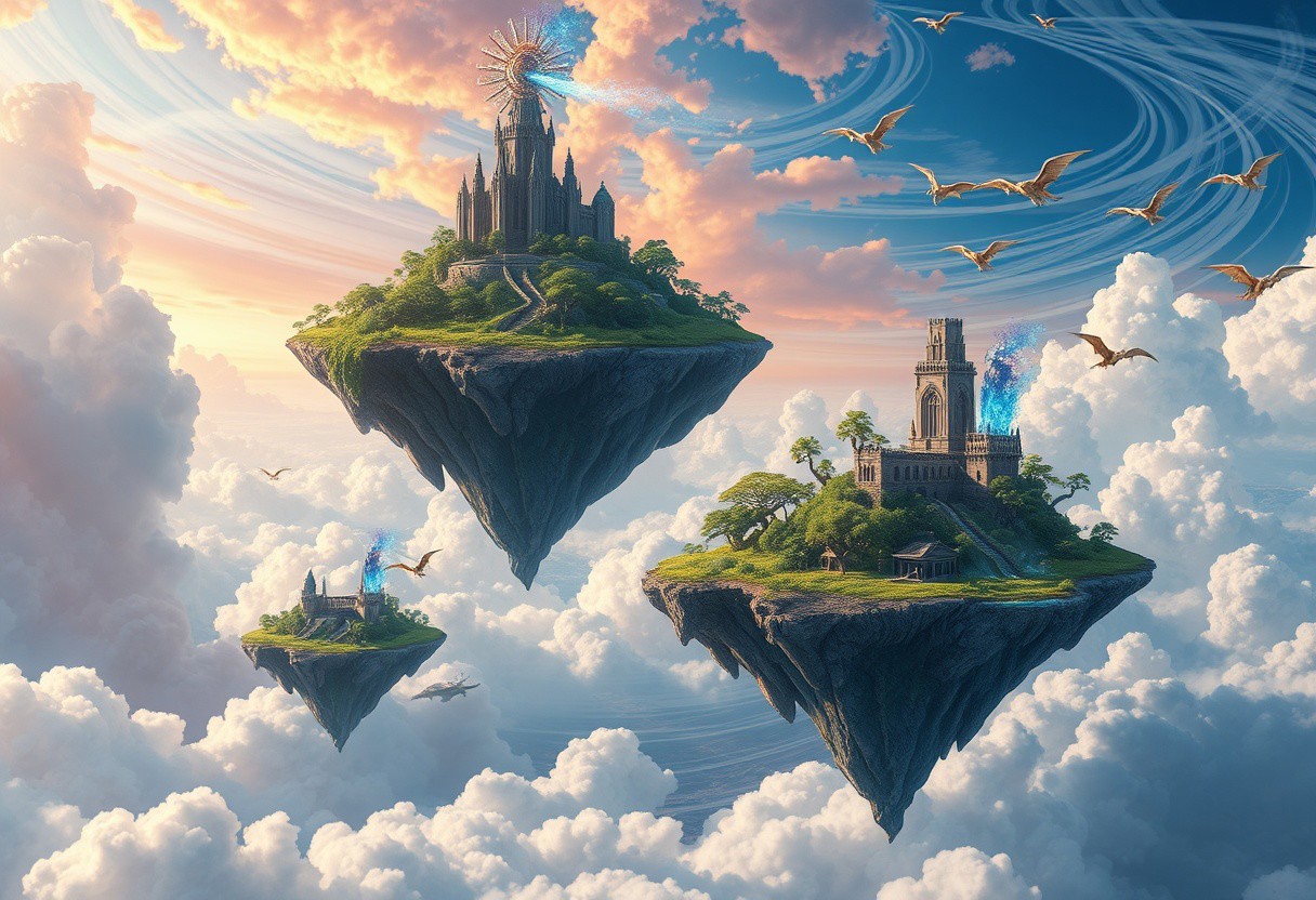 ((blue, orange, pink, sky)), clouds, swirling, 3 floating continent sized islands, the islands are floating high above the ocean, the islands are floating gracefully, the islands are spaces apart, crystals are floating around the islands, eastern dragons are flying between the islands,mountains on floating islands, massive forests on floating islands, jungle trees, vines, beautiful plants, ruins on floating islands, castle ruins, bridge ruins, tall spires on floating islands, crumbling spires, large crystals above spire, blue crystals , red crystals , floating crystals , crystals floating in sky, trees on floating, exposed earth underneath floating island, dragons flying in sky, dinosaurs on floating islands, jungle ruins, landscapes, eastern dragon, intricate details, background colourful, cloud streams, dynamic, vibrant colours, high quality, detailed, realistic, beautiful,