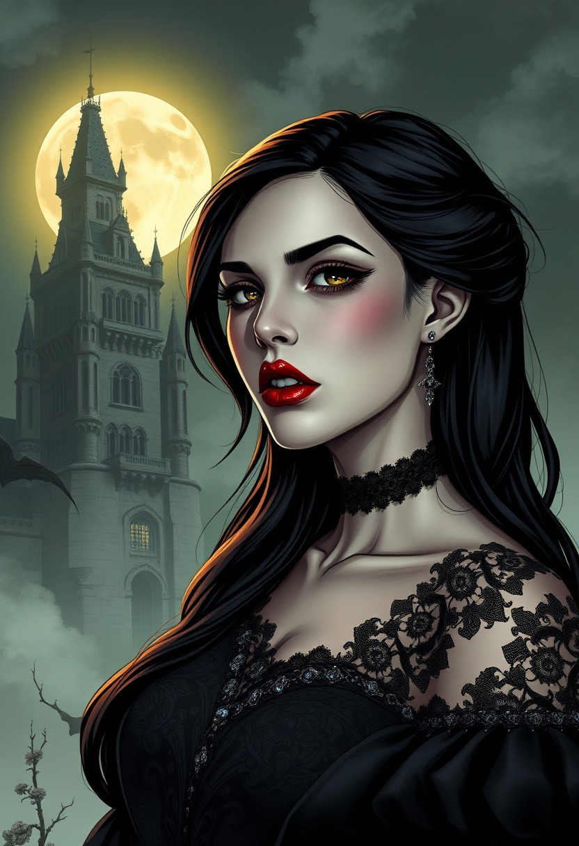 A highly detailed and realistic depiction of a gothic vampire woman. She has striking, sharp features and full, thick lips accentuated by a dark crimson hue, giving her a seductive and commanding presence. Her pale, ethereal skin seems to glow faintly under the moonlight, while her piercing eyes, with a faint crimson glint, exude a sense of danger and allure. Her fangs are sharp and elegant, peeking slightly from her lips. She has long, flowing dark hair that cascades around her shoulders, contrasting beautifully with her ornate gothic dress adorned with intricate lace and jewel accents. The background is an atmospheric, misty gothic scene with a towering ancient castle silhouetted against a glowing full moon. Soft, eerie lighting enhances the supernatural allure of the scene, creating a balance between beauty and menace. Medieval fantasy. Semi-realistic comic gothic style.