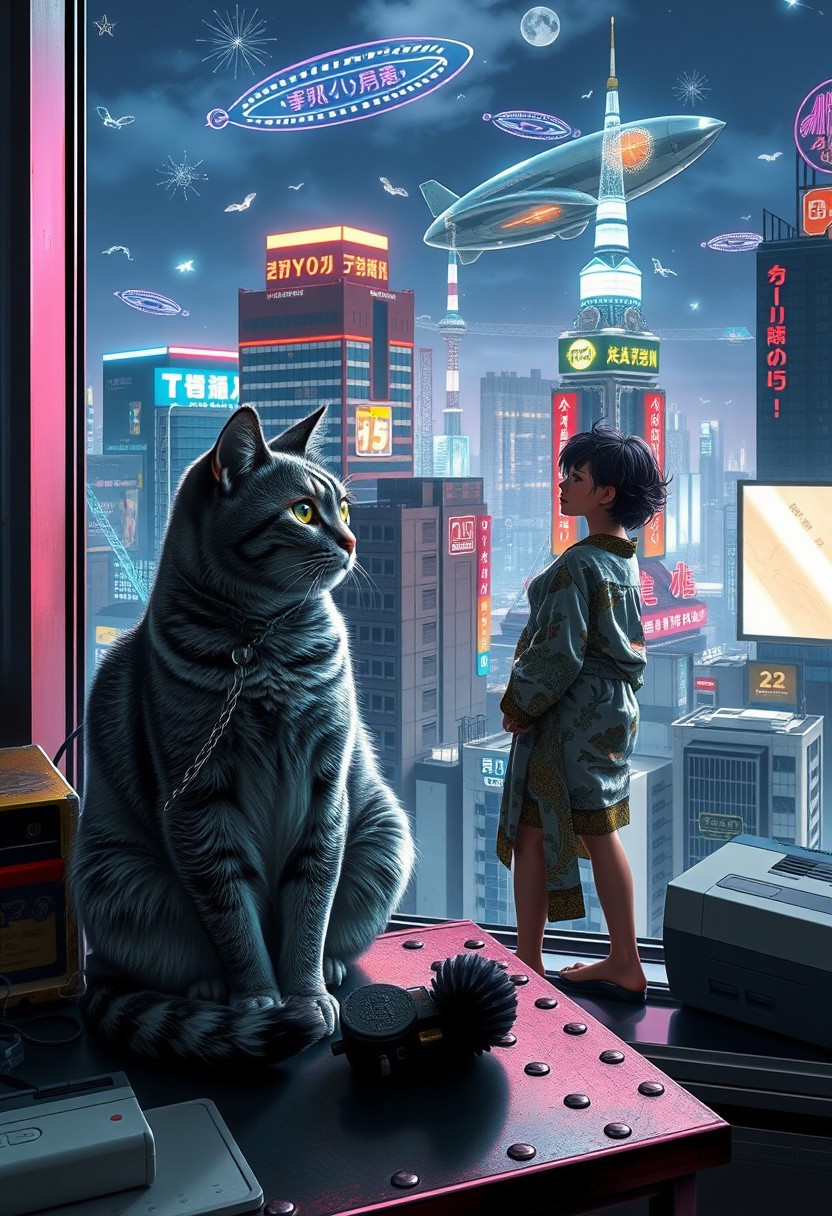 Grey tabby cat with green blue eyes sits on a cluttered metal riveted desk next to a maneki neko statue and a small Nintendo NES, the cat is looking out to a floor to ceiling window that looks out over a futuristic cyberpunk Tokyo skyline with skyscrapers, holographic advertisements, and futuristic airships covered with lights and advertisements in Japanese, a tall thin beautiful young woman, 22 years old, is standing next to the cat looking out at the city through the window, The woman is dressed in an ornate japanese style bath robe, exposing her lower legs. The woman's hair is messy from just waking up. Artistic cyberpunk, dynamic perspective, a hologram of a woman wearing lingerie is visible on a nearby building,