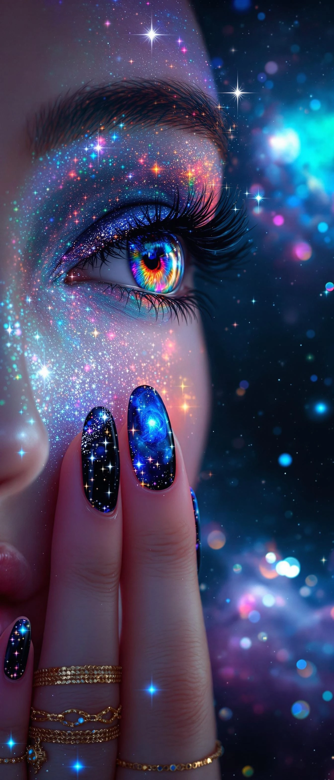 Ultra-realistic image: a woman's eye, close-up, with a rainbow iris and bright makeup becomes the central element of the composition. The woman's eye, surrounded by sparkling eyelashes covered in glitter, looks straight at you, creating a sense of depth and mystery. Inside the iris, cosmic landscapes, stars and galaxies are reflected, as if the eye is a window into another universe. In the foreground, next to the eye, a woman's hand with a unique manicure is depicted. The nails are decorated in a space style: a black and blue gradient with shimmering stars and galaxies, as well as elegant gold chains that wrap around the tips of the nails, adding luxury and sophistication. The fingers of the hand are adorned with exquisite jewelry: thin gold bracelets and rings with precious stones that shimmer in the light. The background of the image is a cosmic space with soft shimmers of blue, purple and black colors, creating a sense of infinity and mystery. Nebulae and star clusters are visible in the distance, adding depth and magic to the scene. The overall atmosphere of the image is filled with the magic of beauty and the mysticism of charm. The woman's eye, like a portal to another world, attracts the gaze, and the details of the manicure and jewelry add elegance and luxury. This image is perfectly detailed and photorealistic. img_photo_48153.jpg