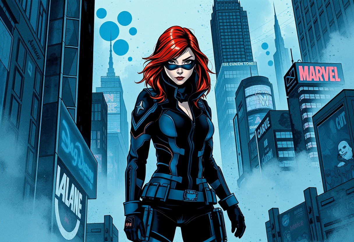 Black Widow, urban comics, blue patterns, Marvel, sci-fi, high tech, iconographic, glitchy background, watercolor, ink, fog, interactive, high detail, art style by Clayton Crane + Ross Tran + Rachel Walpole + Jessica LeVay + Dan Wolbert + Simon Stålenhag + Brian Stelfreeze