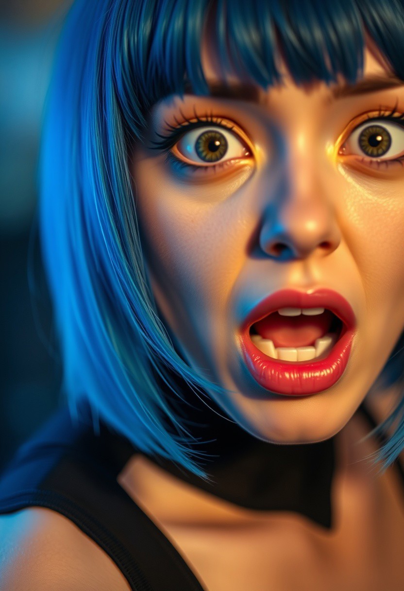 Closeup portrait of shocked Cyber Beauty with big wide open eyes and mouth and blue hair bangs and bob haircut wearing a bodysuit. She looks guilty like she was caught red-handed.
