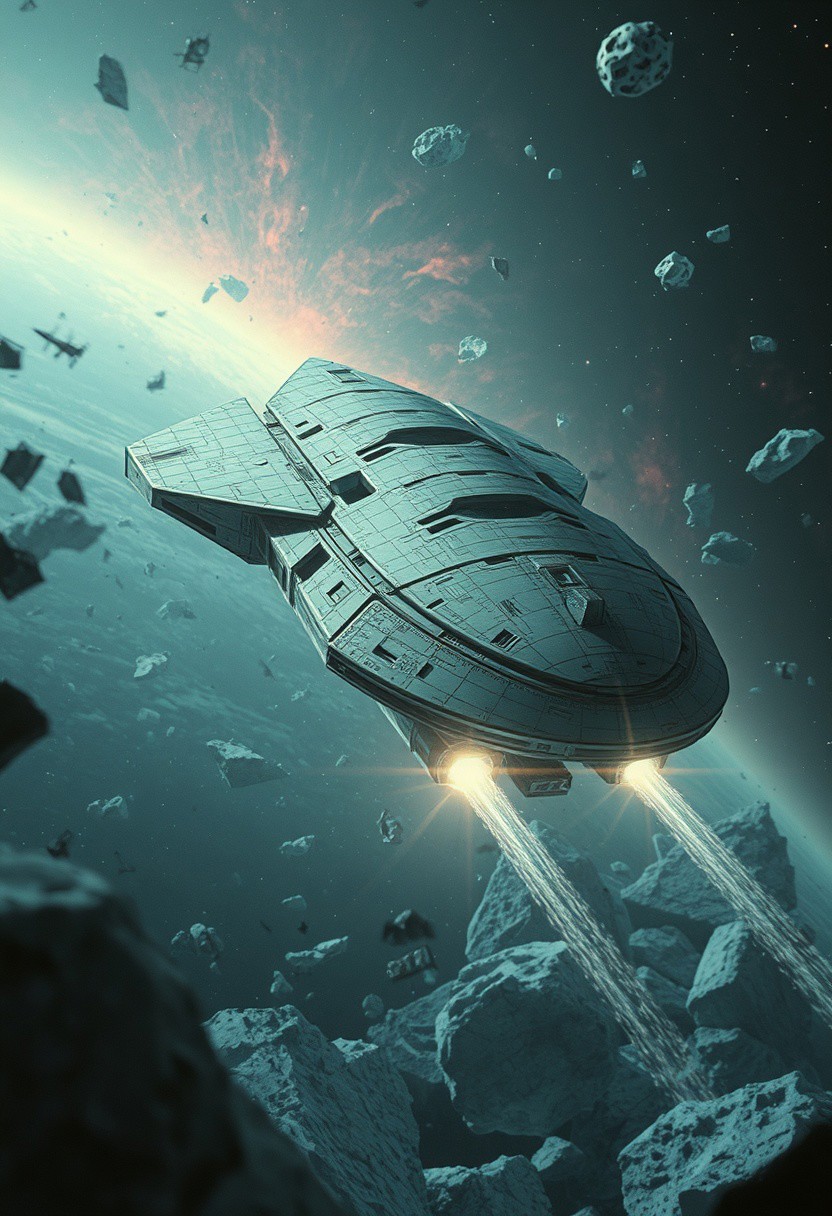 zavy-fnrt, Ethereal impression, cold vibrant pale spectral ethereal Natural Dramatic cinematic lighting, meticulous verisimilar realism, authentic candid in real life High resolution HD masterwork 32K DSLR fine art Photo with analog film, immense but worn decrepit spaceship (Flattened cylinder with blunted arrowhead design) coating through space in debris field between chunks of (random asymmetrical ice asteroid shards that are refracting light from a vibrant nebula) on sputtering failing engines, in action, unique Sui generis, ghostly science-fantasy reality, ornate, intricate, Extremely high-resolution details, photographic, realism pushed to extreme, fine texture, incredibly lifelike smoothly realistic textures, verismo details, . in motion, Dark, mysterious, haunting, dramatic, ornate, special effects shot . shallow depth of field, vignette, highly detailed, high budget, bokeh, cinemascope, moody, epic, gorgeous, film grain, grainy . Extraterrestrial, cosmic, otherworldly, mysterious, sci-fi, highly detailed .professional, 4k, highly detailed $low resolution, watermark, signature, bad anatomy, bad hands, oily skin, shiny skin$,