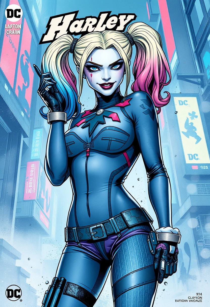 Harley Quinn, urban comics, blue patterns, DC, sci-fi, high tech, iconographic, glitchy backgrounds, watercolor, ink, fog, interactive, high detail, art style by Clayton Crane + Ross Tran + Rachel Walpole + Jessica LeVay + Dan Walbert + Simon Stålenhag + Brian Stelfreeze