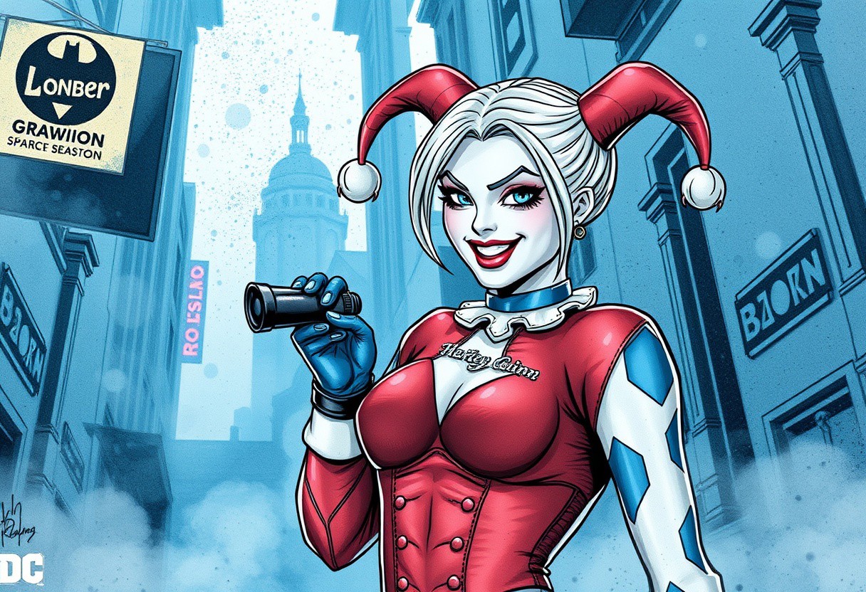 Harley Quinn, urban comics, blue patterns, DC, sci-fi, high tech, iconographic, glitchy backgrounds, watercolor, ink, fog, interactive, high detail, art style by Clayton Crane + Ross Tran + Rachel Walpole + Jessica LeVay + Dan Walbert + Simon Stålenhag + Brian Stelfreeze