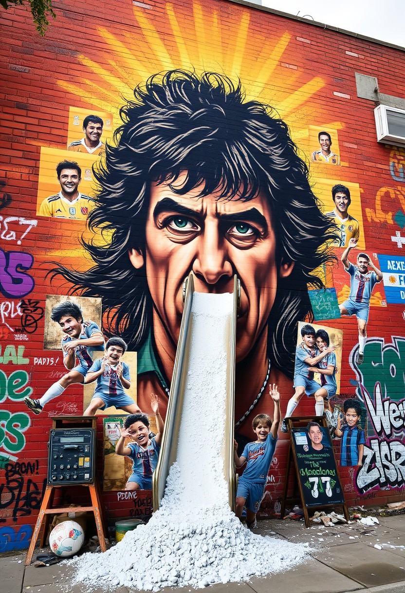 “A surreal and detailed mural of Diego Armando Maradona painted on a large urban brick wall, featuring multiple iconic moments of his career in a collage style. Maradona’s central figure is depicted with expressive eyes, his legendary long hair, and a radiant golden aura around his head symbolizing his legacy. From the nostrils of one prominent portrait, a 3D child slide emerges, winding down dramatically and covered in white powder, symbolically gathering in a pile on the floor. Around him, smaller depictions of his ‘Hand of God’ goal, his joyful celebrations, and a young Maradona playing in the streets of Buenos Aires are painted. The setting includes vivid graffiti tags and urban decay, creating a powerful mix of nostalgia and raw urban energy, with vibrant colors and symbolic contrasts highlighting his complex story.”