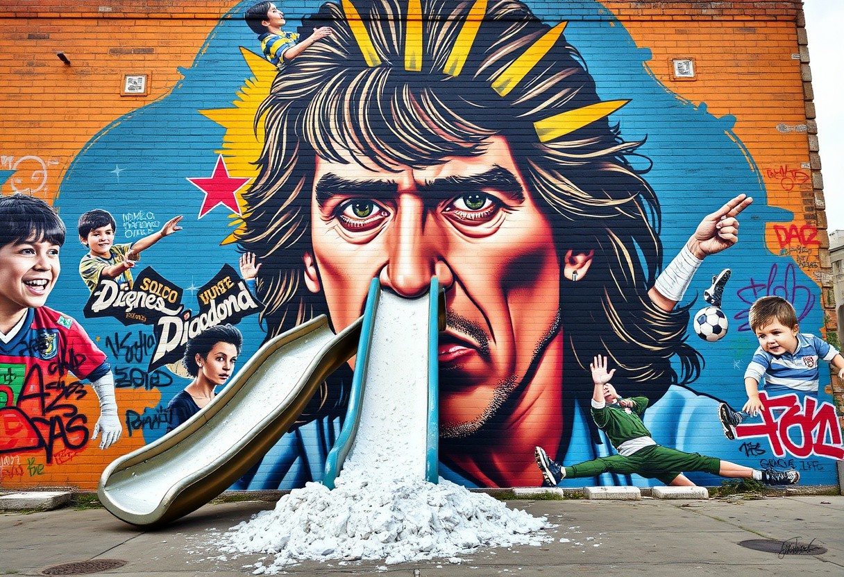 “A surreal and detailed mural of Diego Armando Maradona painted on a large urban brick wall, featuring multiple iconic moments of his career in a collage style. Maradona’s central figure is depicted with expressive eyes, his legendary long hair, and a radiant golden aura around his head symbolizing his legacy. From the nostrils of one prominent portrait, a 3D child slide emerges, winding down dramatically and covered in white powder, symbolically gathering in a pile on the floor. Around him, smaller depictions of his ‘Hand of God’ goal, his joyful celebrations, and a young Maradona playing in the streets of Buenos Aires are painted. The setting includes vivid graffiti tags and urban decay, creating a powerful mix of nostalgia and raw urban energy, with vibrant colors and symbolic contrasts highlighting his complex story.”