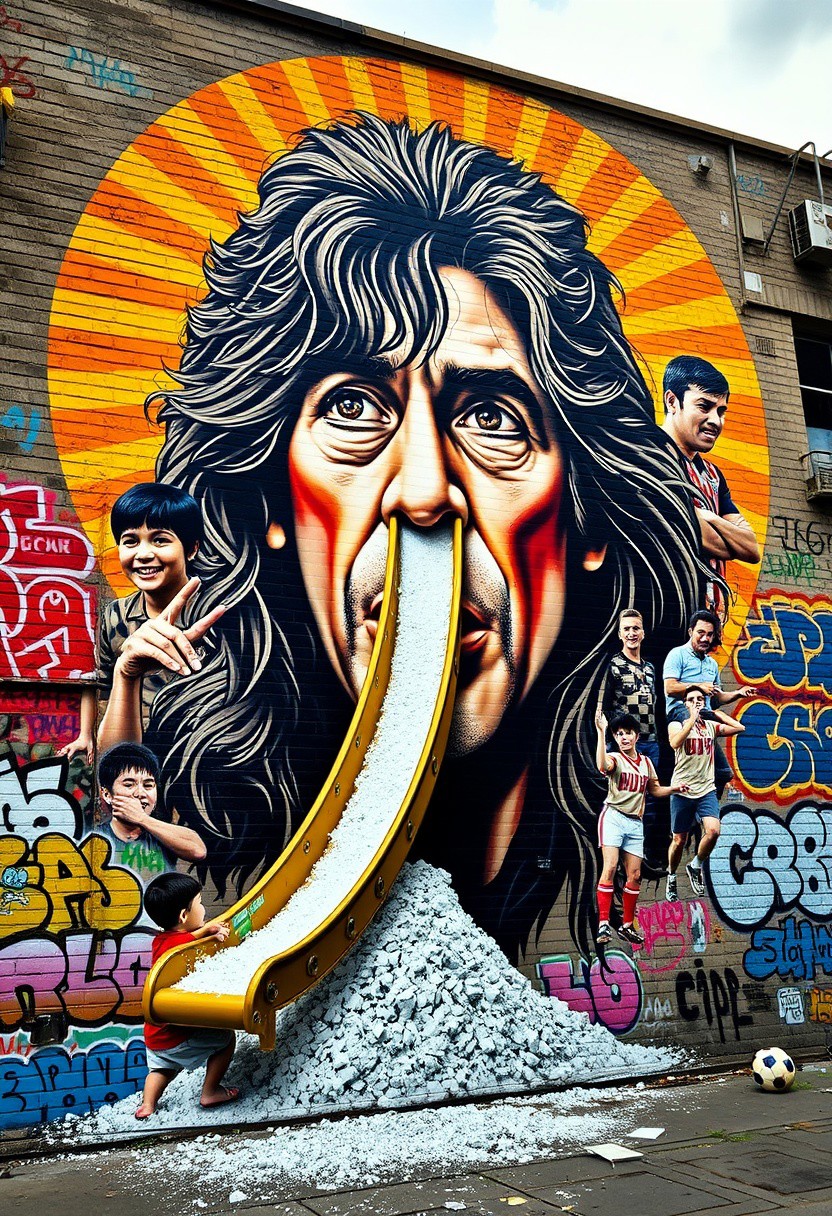 “A surreal and detailed mural of Diego Armando Maradona painted on a large urban brick wall, featuring multiple iconic moments of his career in a collage style. Maradona’s central figure is depicted with expressive eyes, his legendary long hair, and a radiant golden aura around his head symbolizing his legacy. From the nostrils of one prominent portrait, a 3D child slide emerges, winding down dramatically and covered in white powder, symbolically gathering in a pile on the floor. Around him, smaller depictions of his ‘Hand of God’ goal, his joyful celebrations, and a young Maradona playing in the streets of Buenos Aires are painted. The setting includes vivid graffiti tags and urban decay, creating a powerful mix of nostalgia and raw urban energy, with vibrant colors and symbolic contrasts highlighting his complex story.”