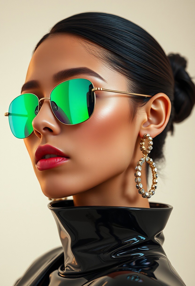 The reflective surfaces of her earrings and outfit create a dynamic interplay with the environment, emphasizing her sleek presence. The minimalist background allows the viewer to focus on her eye-catching fashion and makeup. Captured with a Sony A7R IV camera and a 50mm f/1.2 G Master lens for a beauty editorial shoot, this composition highlights her fashion-forward aesthetic. Inspired by avant-garde fashion photography from Sølve Sundsbø, this image blends contemporary fashion and minimalist elegance, embodying mythp0rt and niji_flux styles for a sleek, high-fashion vision. ((glow_skin, iridescent skin, oily skin, portrait))