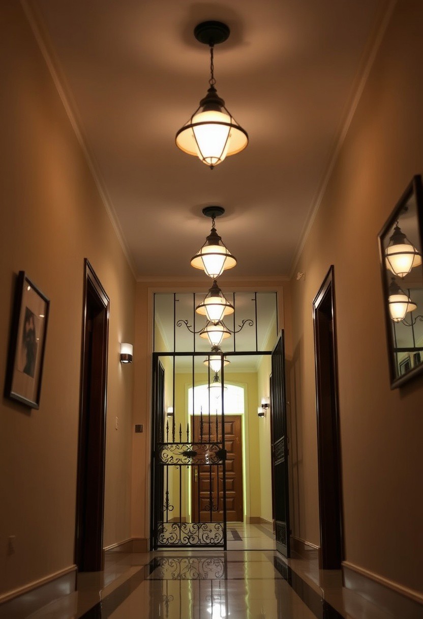 Inside the apartment, there is a hallway with several lights and a gatehouse on both sides