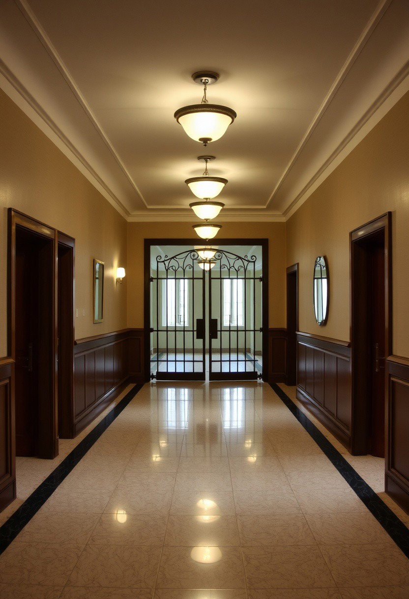 Inside the apartment, there is a hallway with several lights and a gatehouse on both sides
