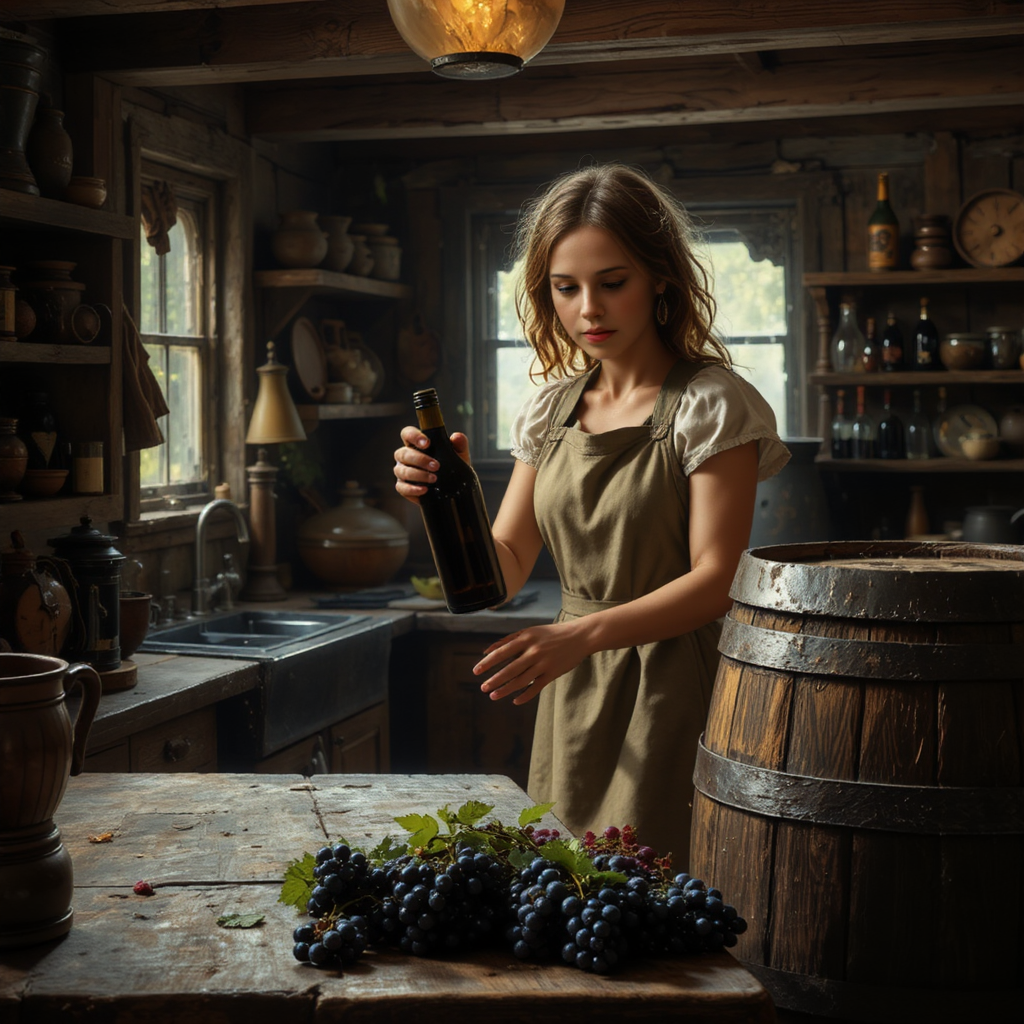 cinematic photo cinematic style, beauty, realism, photorealism, chiaroscuro, high quality, nai23face, a woman in a rustic cottage kitchen, barefoot and wearing a simple apron, bottling homemade wine from a barrel with bunches of grapes on the counter. 35mm photograph, film, bokeh, professional, 4k, highly detailed
