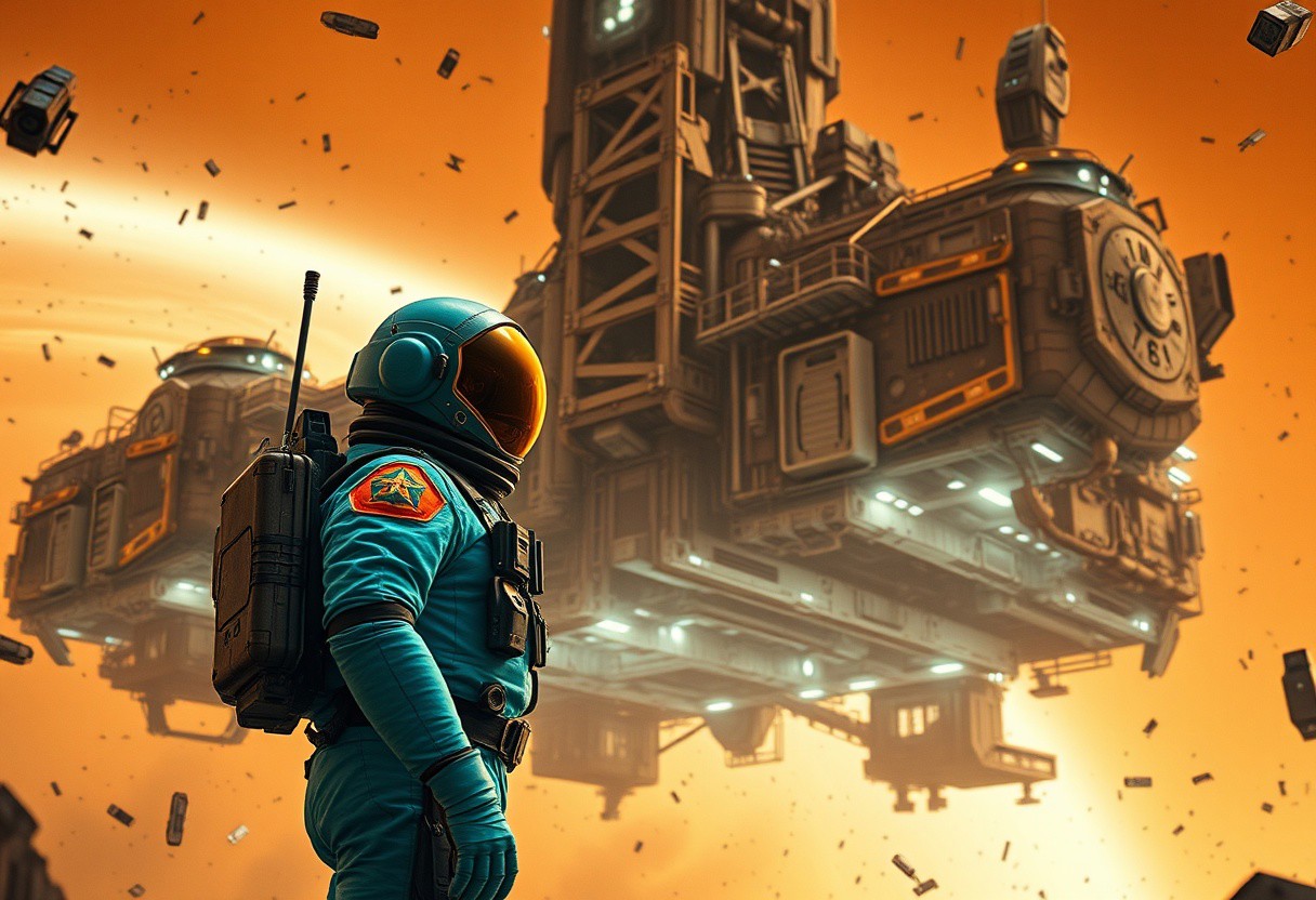 A cinematic shot of an astronaut in a vibrant teal spacesuit standing in the foreground, with a massive, intricate space station or spacecraft as the backdrop. The space station is adorned with numerous lights, windows, and technical details. The astronaut's suit is equipped with various gadgets and patches. The atmosphere is filled with floating debris and a hazy orange hue, suggesting either a celestial event or a post-apocalyptic setting.