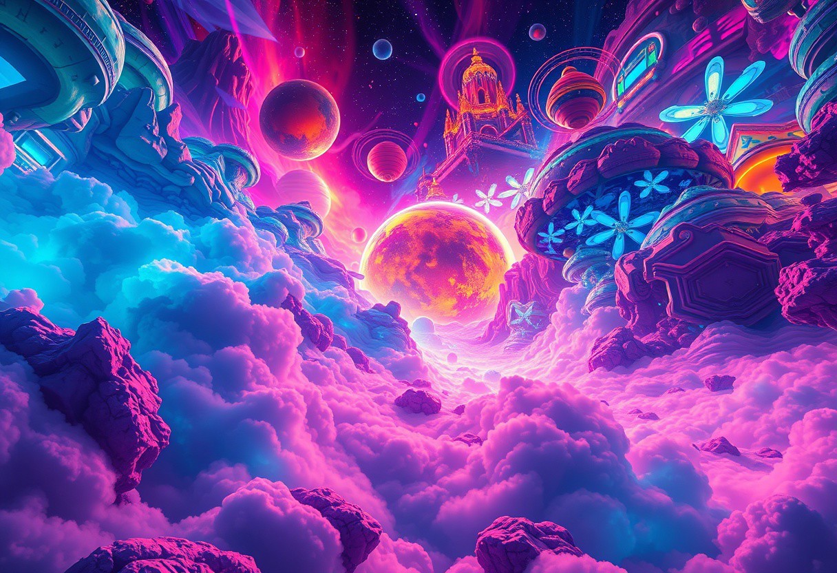 A dreamscape with vibrant neon colors, astonishing artwork, wallpaper, best quality, hyper-detailed, 4k resolution