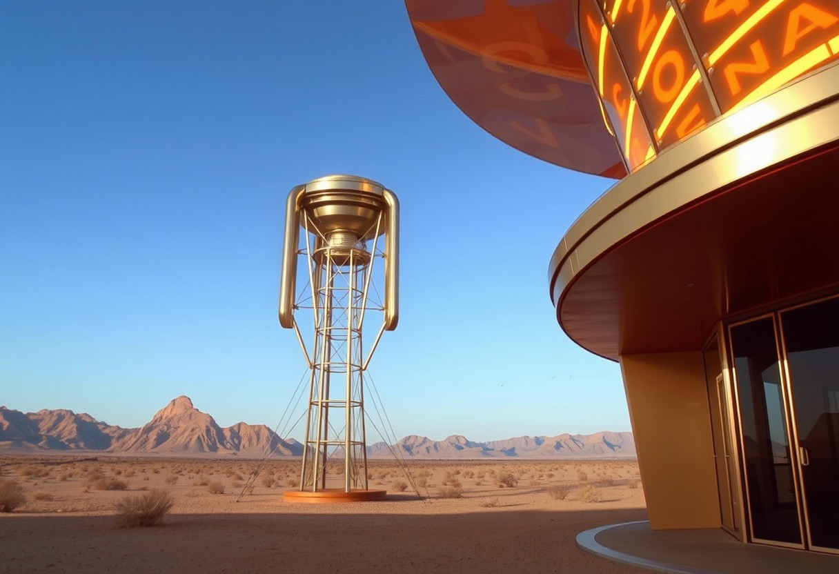 avant-garde, retro futurism , gold and chrome, daylight, california desert, 1970s, robert T, techno style