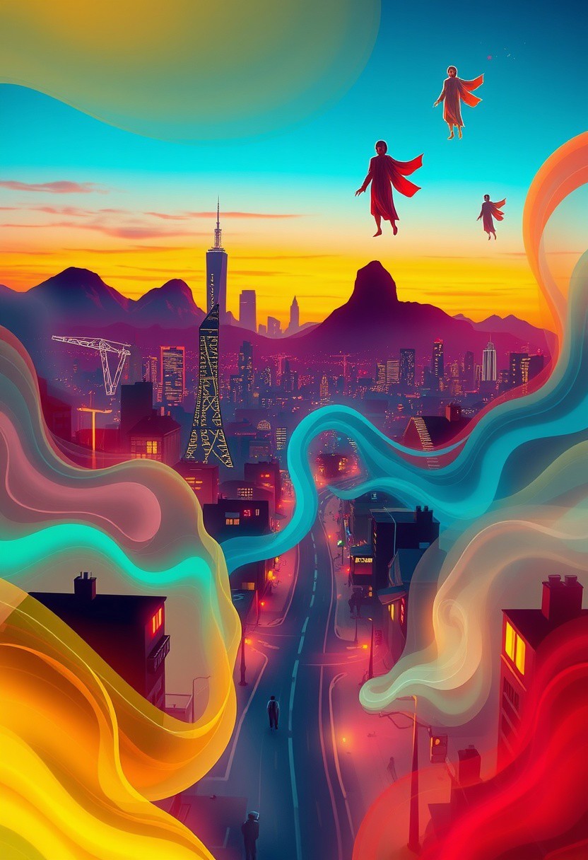 The town features a desolate cityscape with glowing neon lights, abstract flowing shapes merging into the skyline, soft gradients blending between dusk and dawn, and ethereal figures floating in the air, all rendered in a fluid, dreamlike style, emphasizing vibrant colors, motion, and high contrast. The entire composition is vivid and dreamy, evoking a sense of wonder.