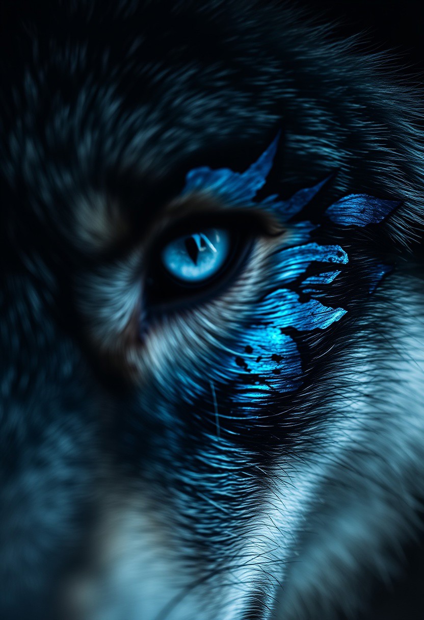 The extreme macro photo captures a fearsome grey wolf's left eye, bathed in a dark and inky contrast. Its piercing pure blue eyes and sharp teeth are visible in the background. The wolf's dark fur, matted and messy around the eye due to the spray paint, contrasts dramatically with the metallic blue markings that adorn its face, particularly around and over the eye, resembling scales or armor. The spray paint gives the markings a wet, messy appearance. The photo is highly detailed and intricate.