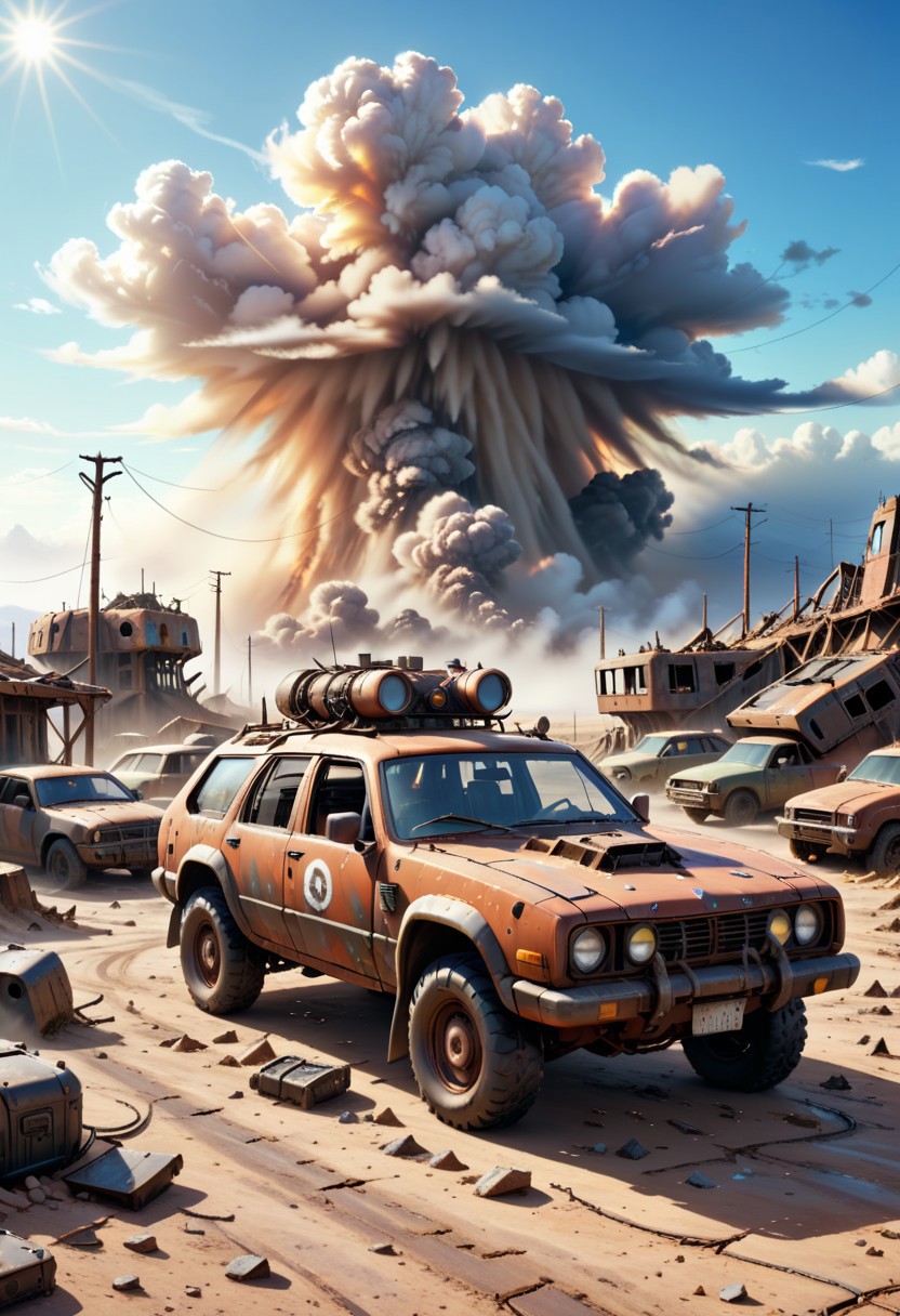 evi@decrepPunk, (post-apocalyptic wasteland, desolate landscape, road warriors, mysterious strangers, dystopian future, atmospheric, dramatic lighting, cinematic composition, 4k resolution, HDR, UHD, highly detailed, extreme detail, depth of field, (rugged terrain, abandoned vehicles, ruins, debris, decaying infrastructure, dust storm, desolation, gritty, gritty characters, leather jackets, goggles, makeshift weapons, gas masks)), telephoto lens, wide-angle lens, Tilt-Shift, dramatic perspective, (bleak, desaturated color palette, intense shadows)